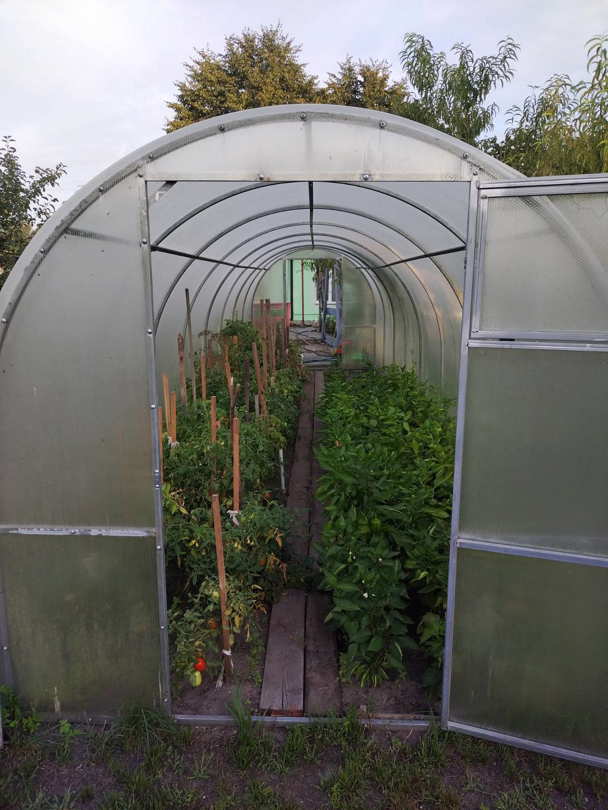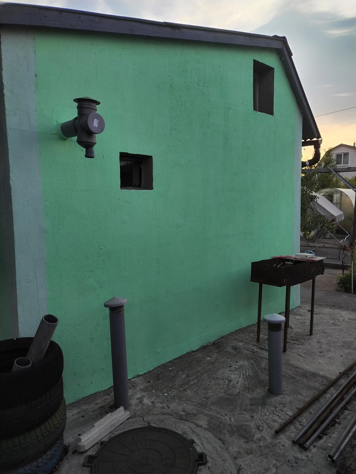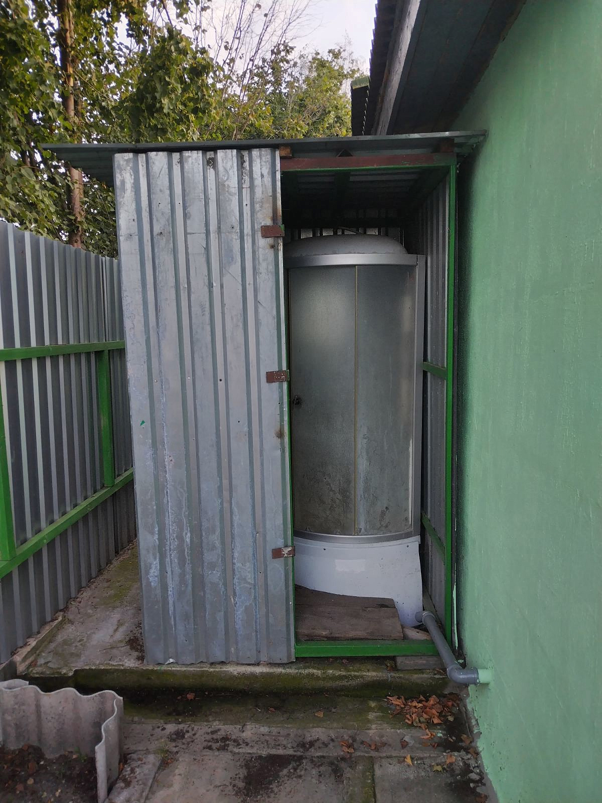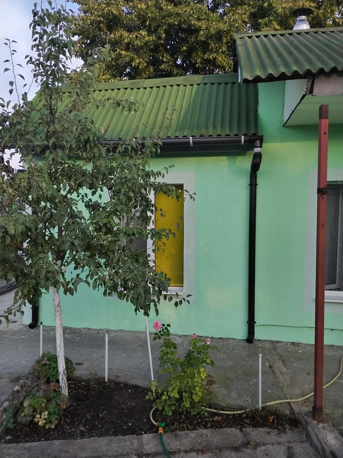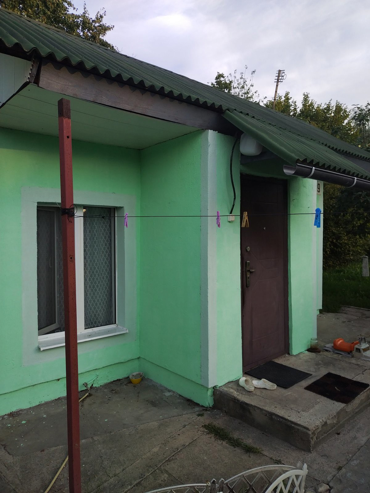 Дом из блоков, 4х9м, утеплен пенопластом и оштукатурен, окрашен. Кровля - зелёный ондулин, окна - ПВХ. Металлическая входная дверь.