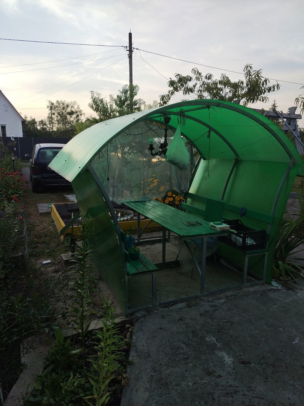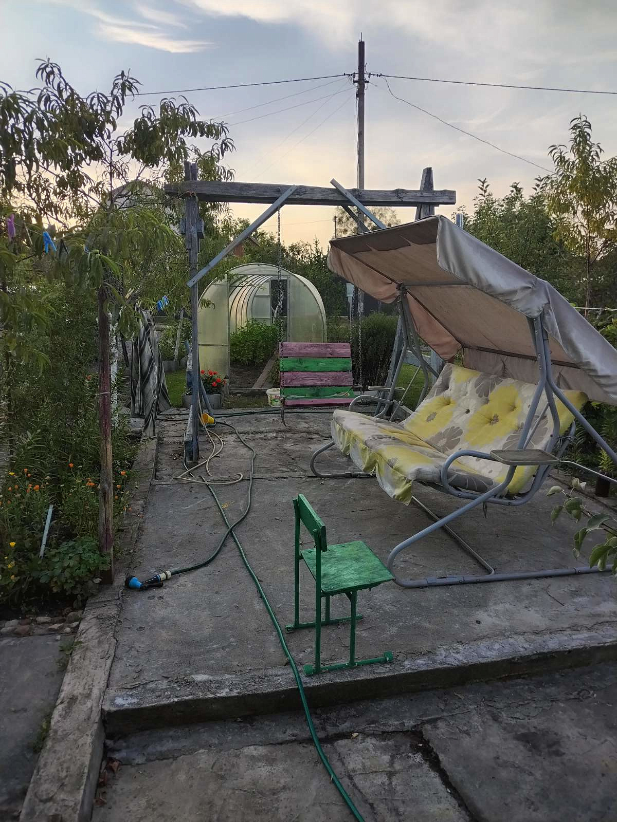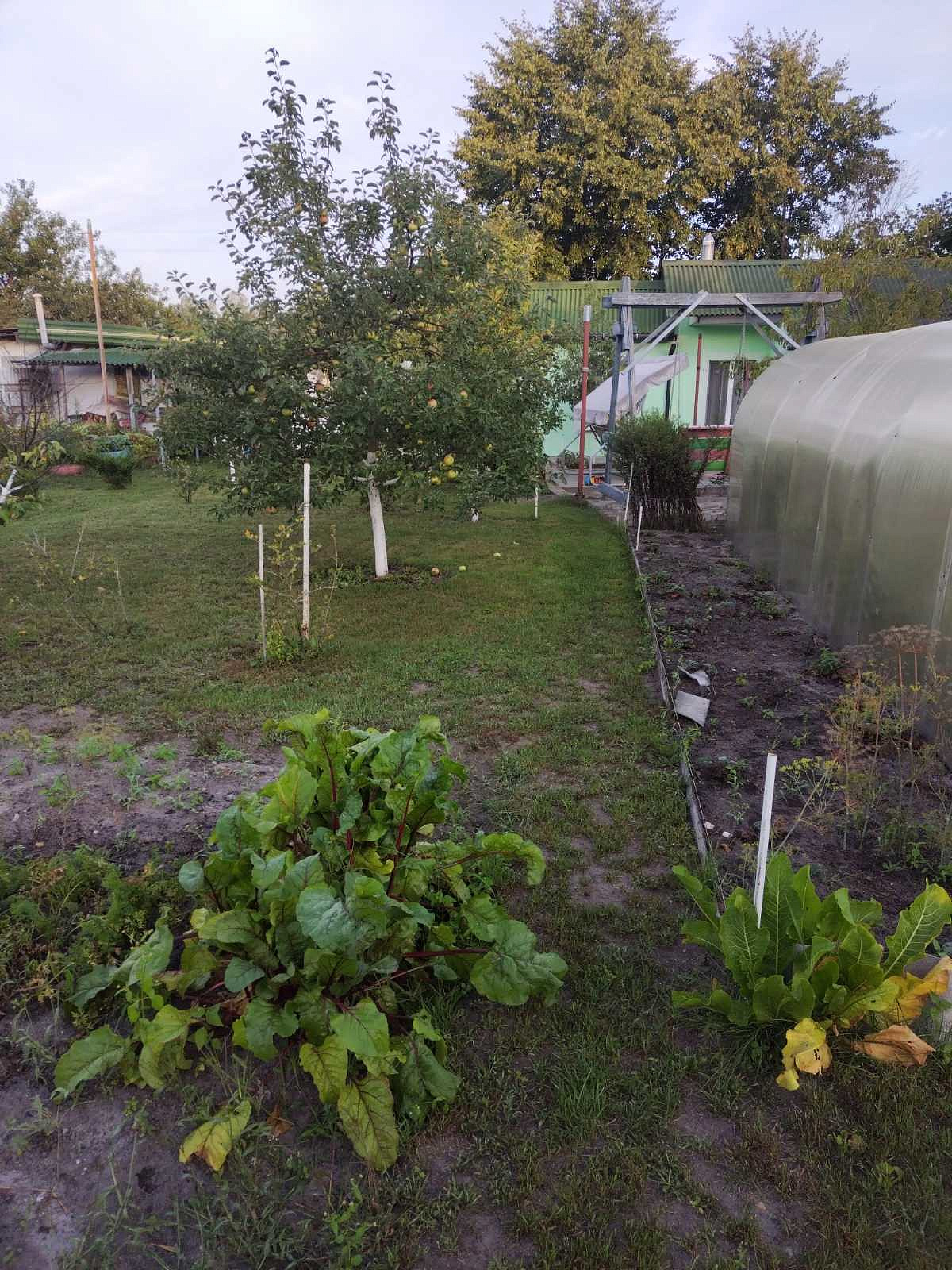 На участке 5.94 сотки рядом с домом-сарай: 6х4 м, большой навес-терраса, беседка, теплица 2х8м, стоянка на две машины. Площадка для бассейна, качели, детская песочница, дорожки.