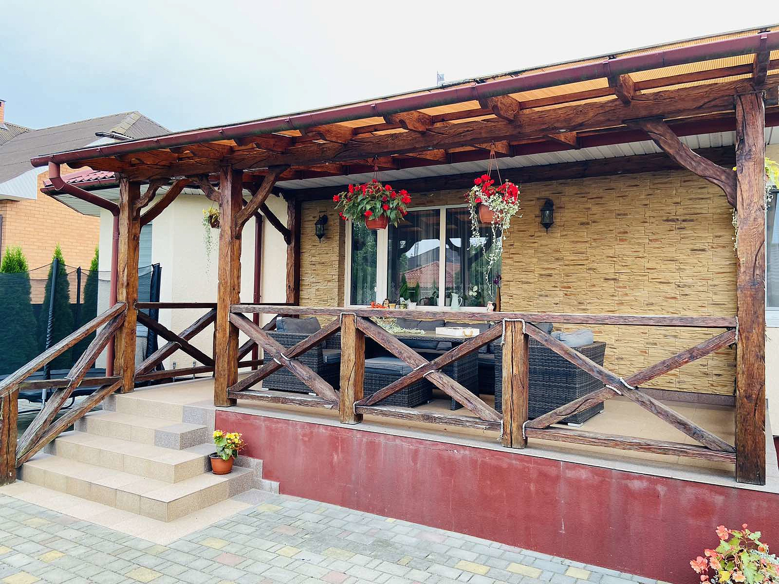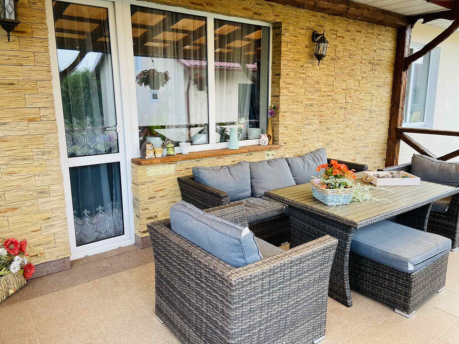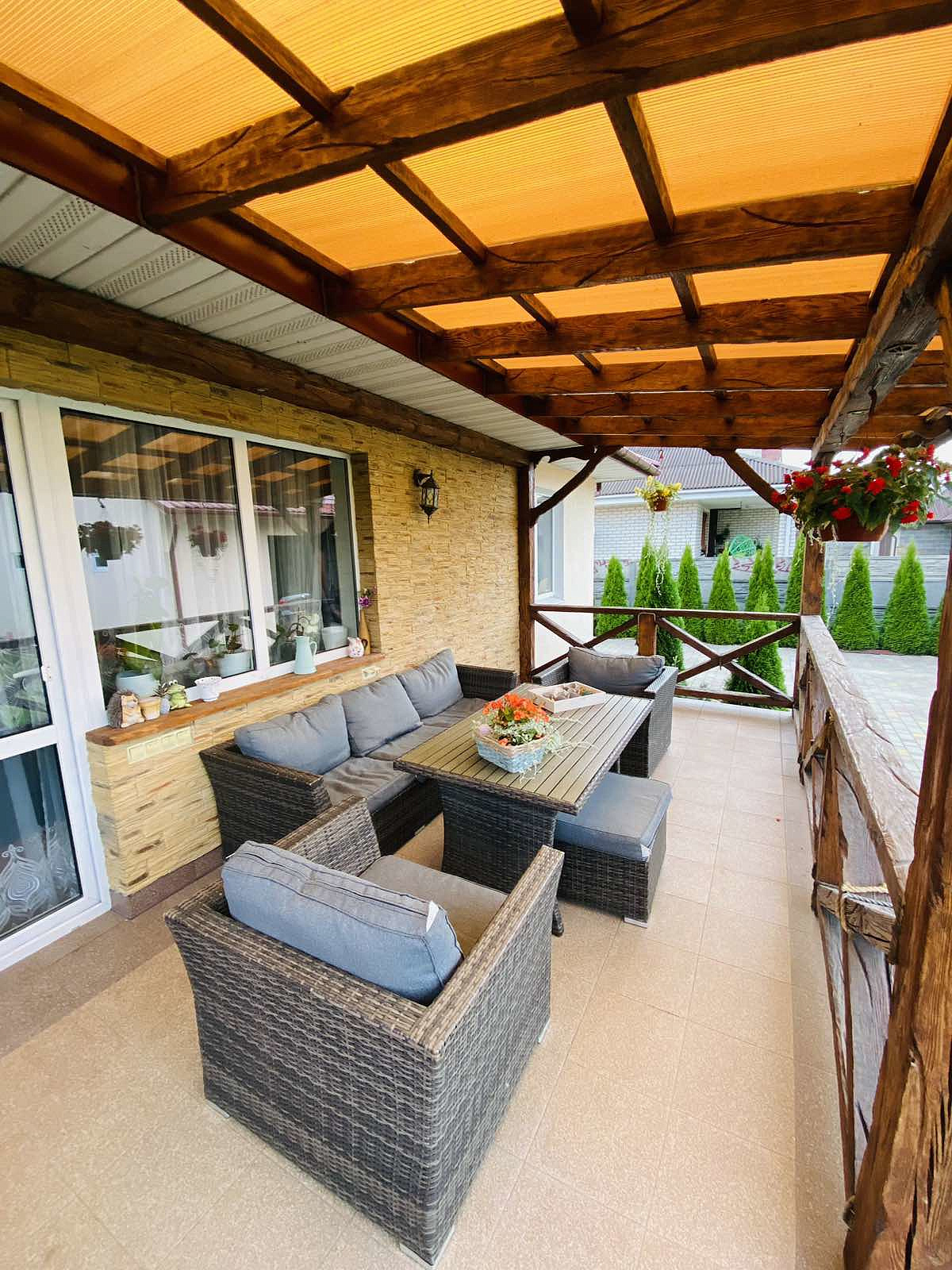 Терраса - нужный элемент этого дома с садовой мебелью активно подчеркивает стиль и характер отделки дома.