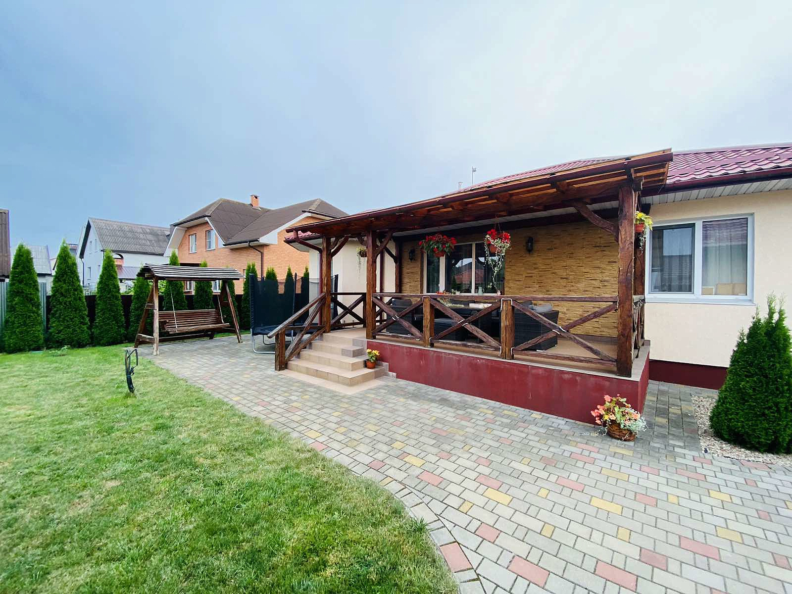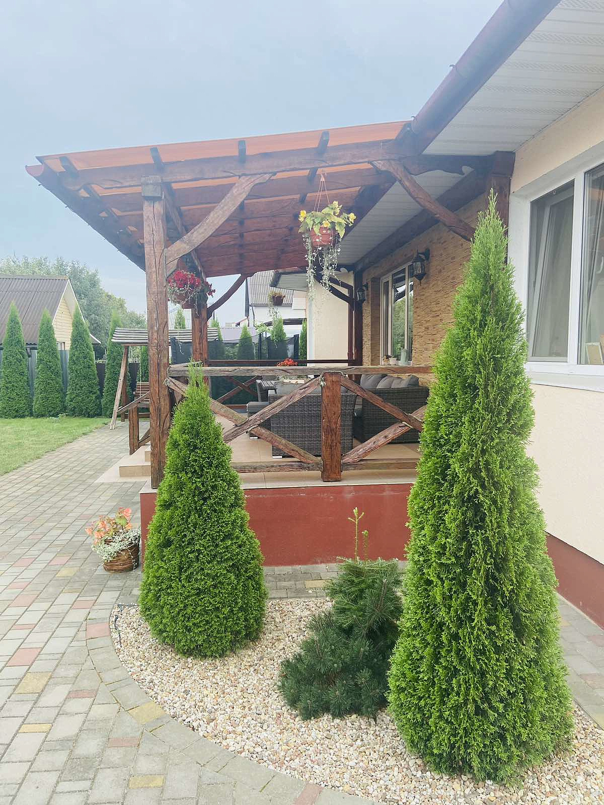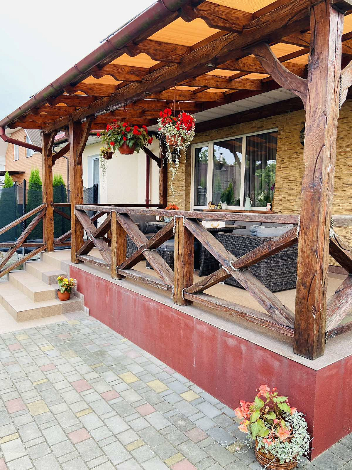 Терраса - нужный элемент этого дома с садовой мебелью активно подчеркивает стиль и характер отделки дома.