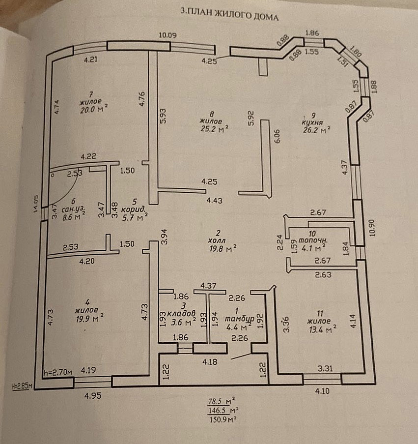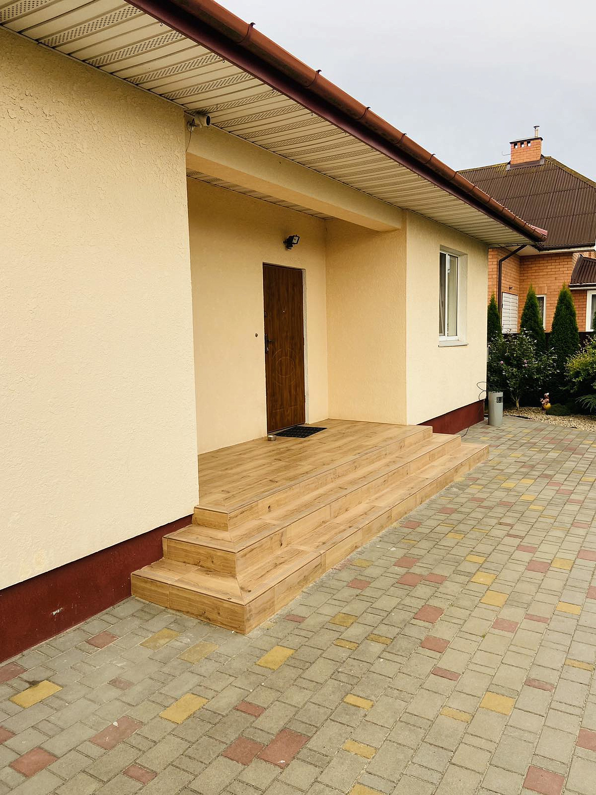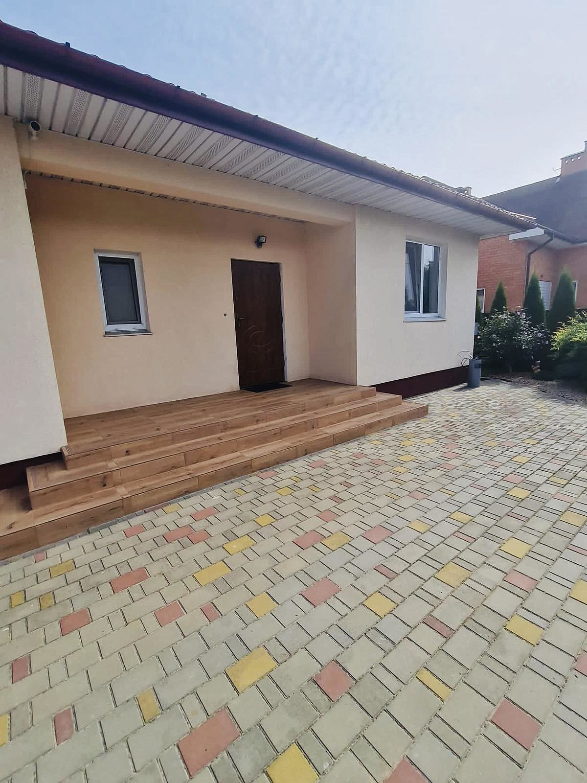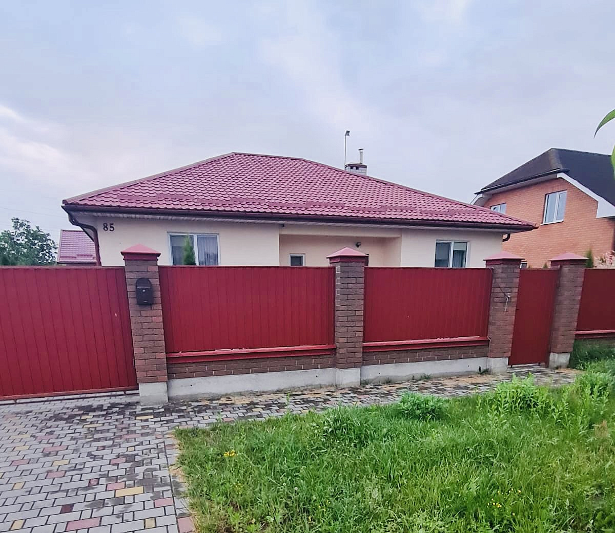 Дом площадью жилых помещений 150,9 м2 не огромен, с просторными гостиной, спальнями, кухней и совмещённым санузлом. На ленточном монолитном фундаменте- стены дома из газосиликата + кирпич+ декоративно-защитная отделочная штукатурка. Цвет атмосферостойкой фасадной краски с высокой степенью защиты от УФО удачно сочетается с крышей. Кровля - качественная металлочерепица-отлично смонтирована и оптимально утеплена. Даже в летний зной в этом доме приятно и комфортно.