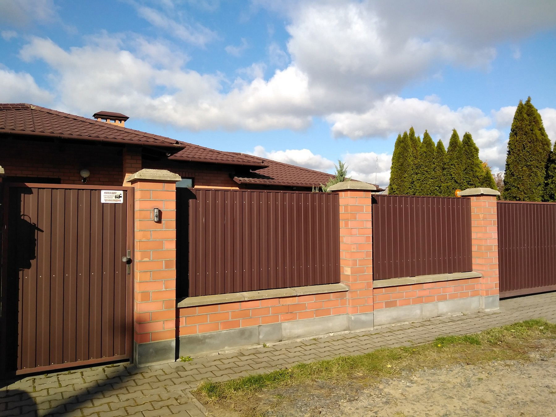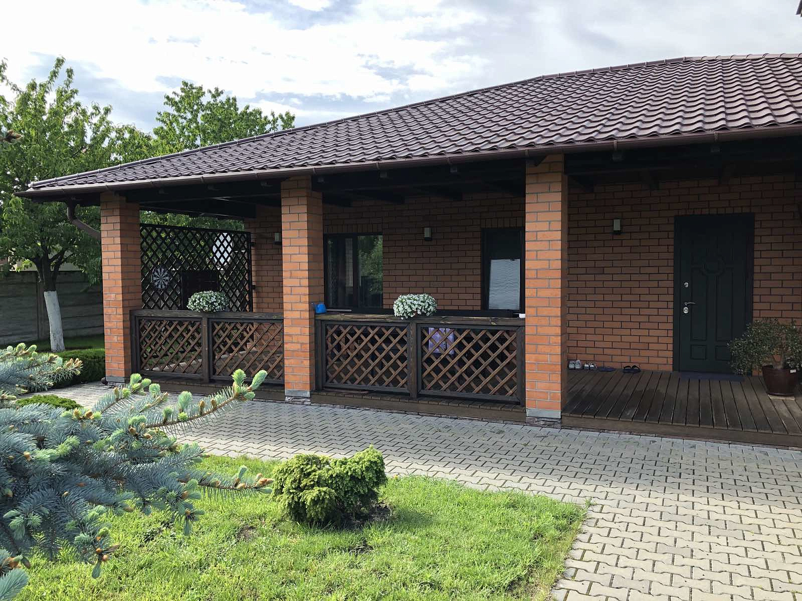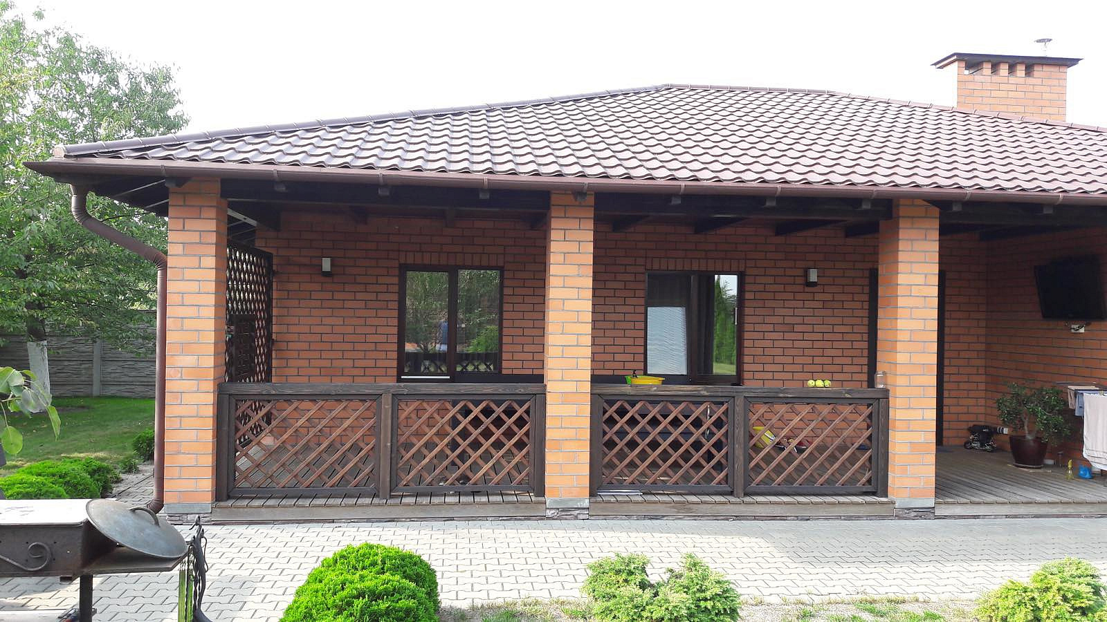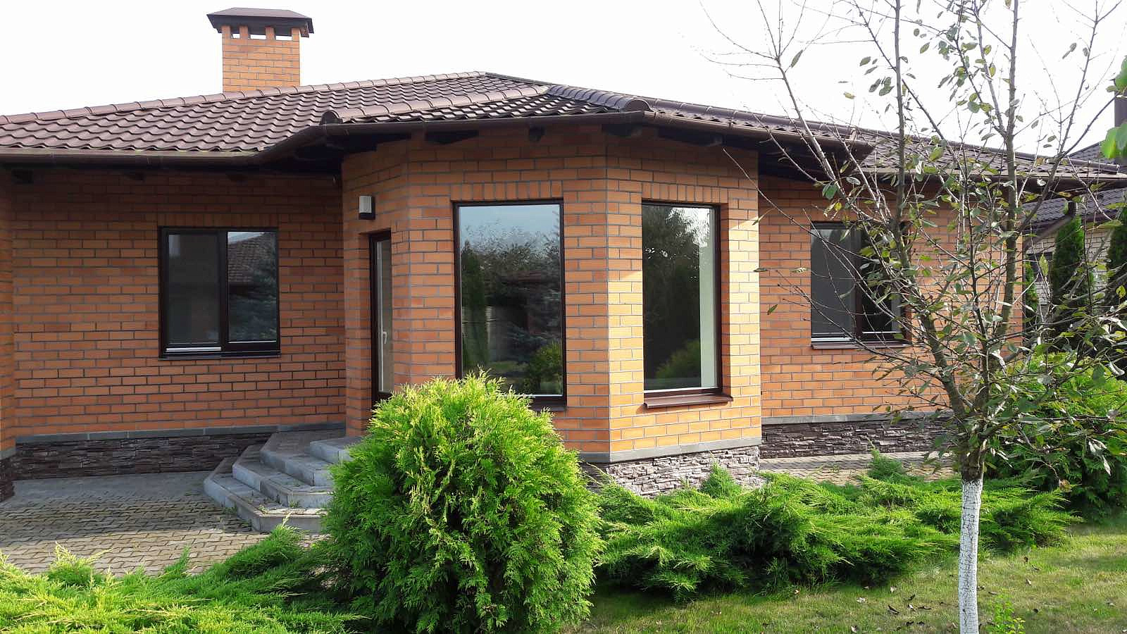 Стены из газосиликатного блока, утеплены минватой и облицованы кирпичом. Железобетонные перекрытия, мощный фундамент, рассчитанный, как и стропильная система, на тяжёлую кровлю из натуральной черепицы. Дома накрыты французской металлочерепицей отменного качества. Окна и подоконники деревянные с тройным остеклением.
