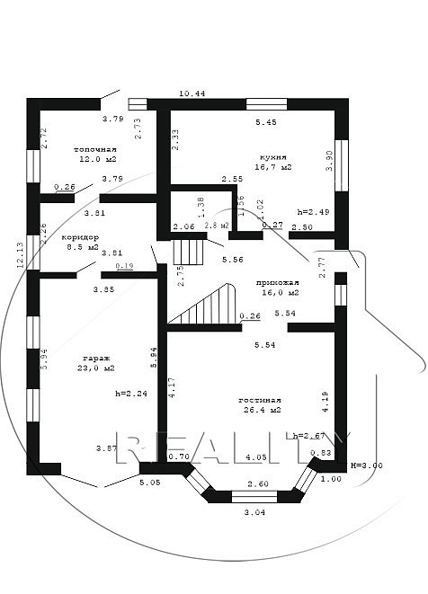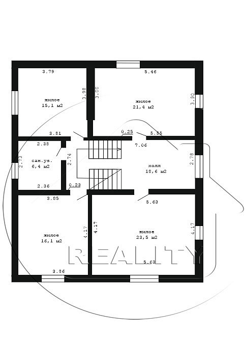 4 спальни: 15,1 м2, 16.1 м2, 21,4 м2 и 23,5 м2, холл 18,6 м2 и совмещенный санузел расположены на мансарде. На первом этаже большая гостиная 26,4 м2, кухня 16,7 м2 и прихожая 16 м2. Глубокий сухой погреб, а также функционально оборудованный выход из дома в гараж и во внутренний двор к зоне барбекю.