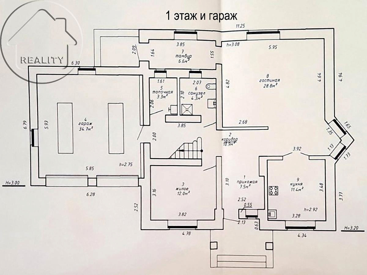 На первом этаже расположены гостиная 28, 8 кв. м., кухня 11, 4 кв. м. комната свободного назначения, гостевой с/у и другие помещения.